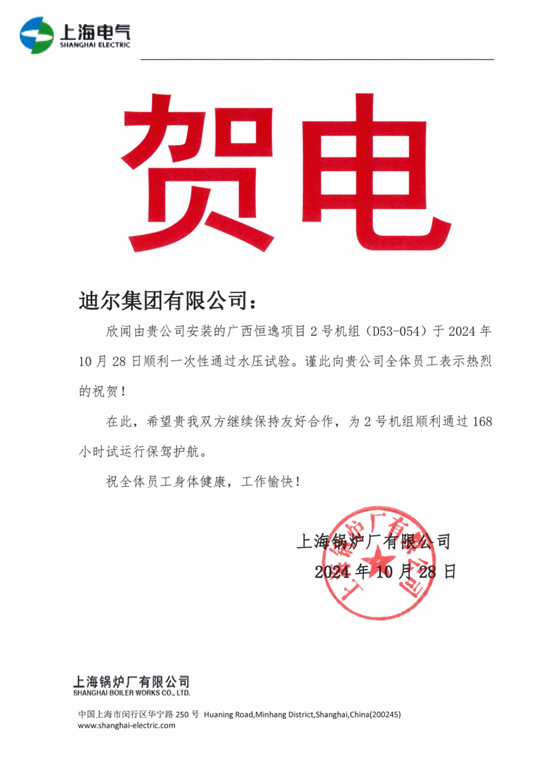 2024年10月28日15點22分,由迪爾集團第二公司承建的廣西恒逸項目2#爐水壓試驗一次成功,為此,上海鍋爐廠有限公司向項目部發(fā)來賀電,業(yè)主及監(jiān)理給予一致好評。