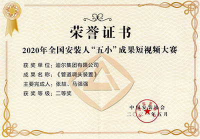 2021年5月,全國安裝人“五小”成果短視頻大賽總決賽在上海東方電視臺演播廳舉行。大賽緊扣“質(zhì)量提升、科技創(chuàng)新、綠色建造”的主題,以短視頻形式來呈現(xiàn),所有參賽作品圍繞安裝行業(yè)實際生產(chǎn)管理、施工技術(shù)、工藝設(shè)備等進(jìn)行的“小發(fā)明,小創(chuàng)造,小革新,小設(shè)計,小建議”的“五小成果”發(fā)掘和展示。公司發(fā)明成果短視頻《管道掉頭裝置》榮獲2020年全國安裝人“五小”成果短視頻大賽二等獎。
