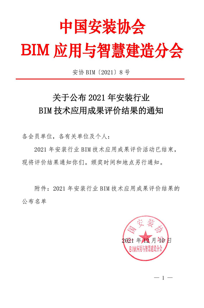 公司BIM成果榮獲安裝行業(yè)BIM技術(shù)應(yīng)用成果“國內(nèi)領(lǐng)先(I類)”評價
